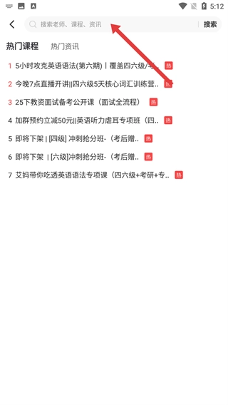 2、在搜索界面的搜索栏里,输入【英语四六级】这类关键词,为查找相关课程做准备。