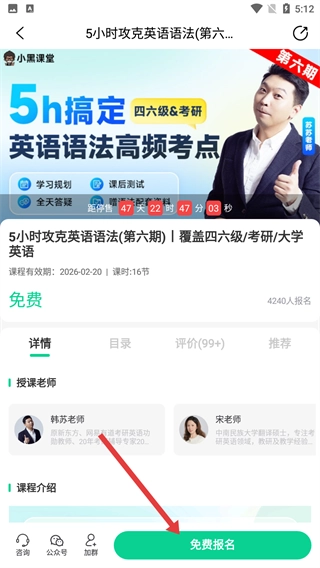 3、在搜索结果里,找到并点击目标课程(例如【5小时攻克英语语法(第六期)】),即可进入该课程的详情页面。