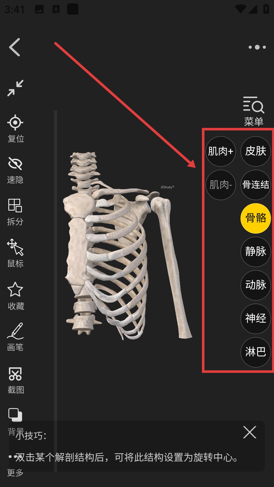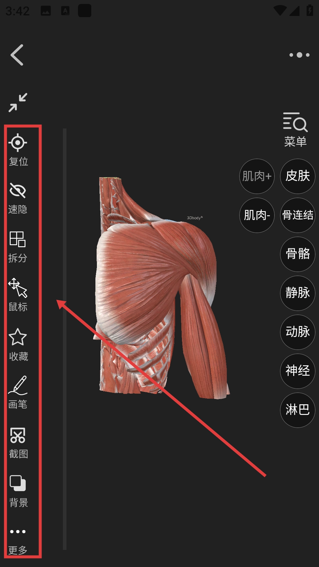 3、在肩部解剖详情页面,可借助右侧的【肌肉+】【皮肤】【骨骼】等功能选项,实现不同解剖结构显示的切换。