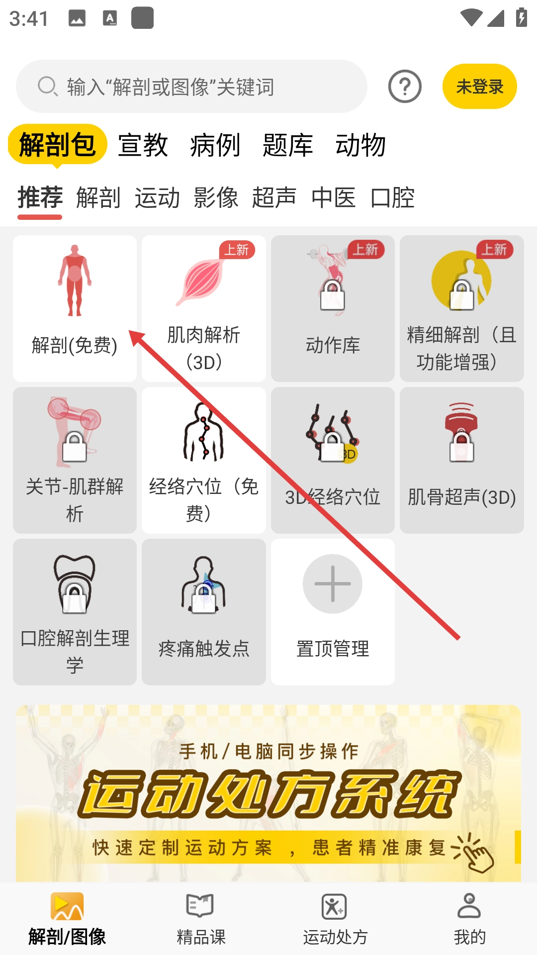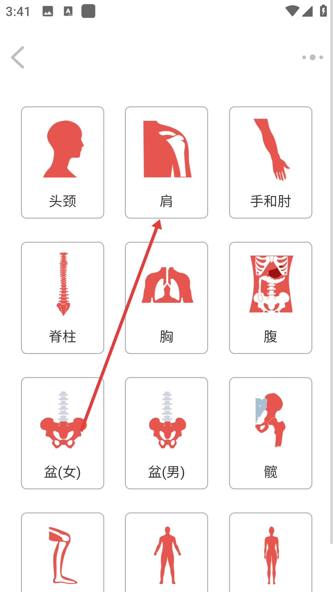 1、点击【解剖】按钮,进入解剖部位选择界面,在此可查看头颈、肩、脊柱等多种解剖部位选项。