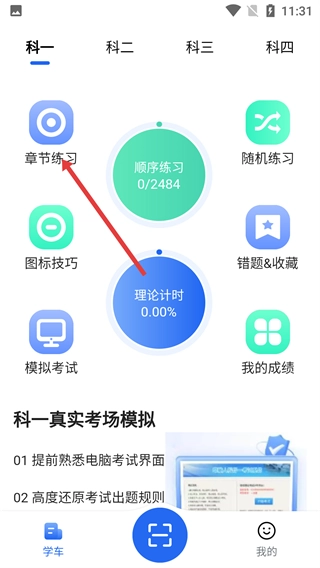 1、进入科目一界面后,点击【章节练习】功能,即可进入按章节细分的练习模块,从而开始进行有针对性的理论知识学习。
