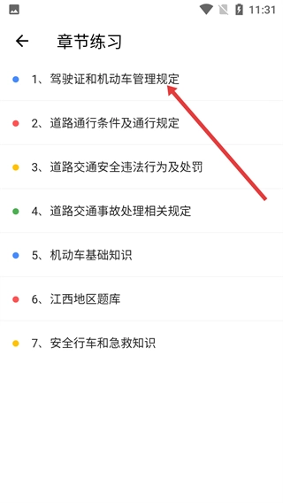 2、在【章节练习】板块里,找到并选择【1-驾驶证和机动车管理规定】这一章节,就能进入该章节的题目练习界面,通过逐个练习来攻克各个知识点。