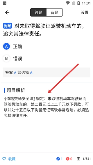 4、完成答题后,点击查看【题目解析】,能够了解题目对应的法条依据,比如《道路交通安全法》的相关内容,从而进一步加深对知识点的理解。