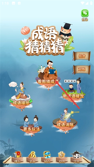 1、在【成语猜猜猜】主界面,点击【看图猜成语】的功能入口,就能进入关卡选择页面,开启成语猜谜挑战。