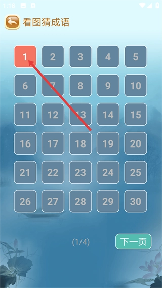 2、进入【看图猜成语】的关卡选择页面后,点击【1】关卡,就能进入该关卡的答题界面。