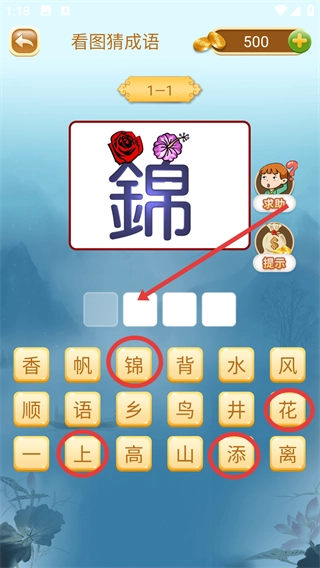 3、在答题界面,依据图片与汉字提示,挑选像【锦】【上】【添】【花】这类汉字,组合成正确的成语来完成答题。