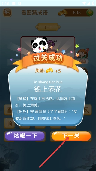 4、顺利通过当前关卡后,点击【下一关】按钮,就能继续挑战后续的成语关卡,还能获得金币奖励。