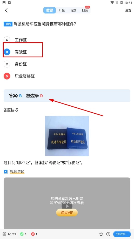 3、做题时,要明确答案是B选项对应的“驾驶证”,并学习相关的答题技巧。