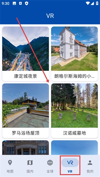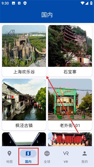 1、在国内、全球、VR对应的页面中,点击感兴趣的景点或内容,就能查看其详细景观。
