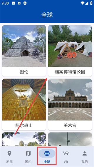 3、点击底部的【全球】按钮,进入全球景点页面后,就能看到图伦、档案博物馆公园等全球范围内的景点选项。