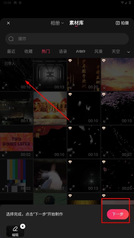 3、在素材库中选定所需素材后,点击【下一步-功能按钮】,即可启动制作流程。
