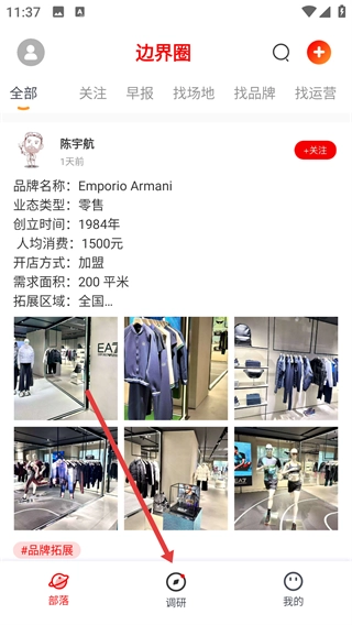 1、在【边界圈】页面,点击底部的【调研】按钮,即可进入调研功能页面。
