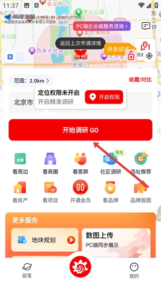 2、在调研页面,点击【开始调研GO】按钮,即可进入区域数据页面。