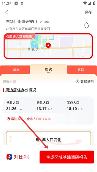 3、进入区域数据页面后,点击【生成区域基础调研报告】按钮,即可跳转至报告设置页面。
