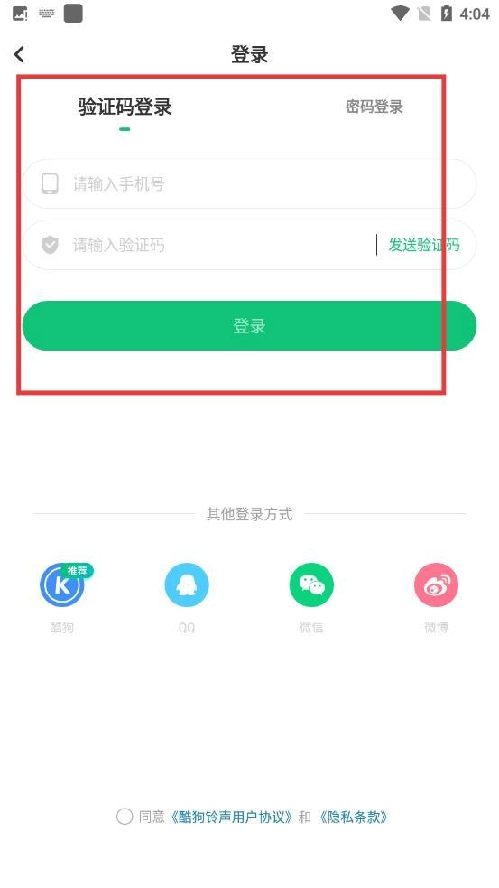 3、进入登录页面后,选择【验证码登录】选项,输入账号,点击获取验证码并输入,勾选同意相关协议后,点击【登录】按钮。
