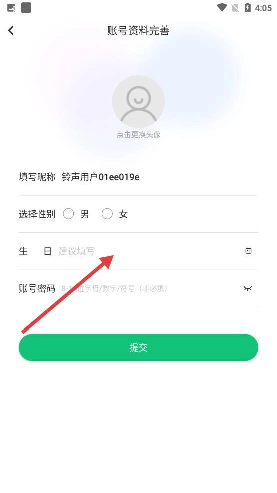 4、登录后进入账号资料完善页面,填写昵称、选择性别、填写生日等信息,点击【提交】按钮,即可完成账号资料的完善。