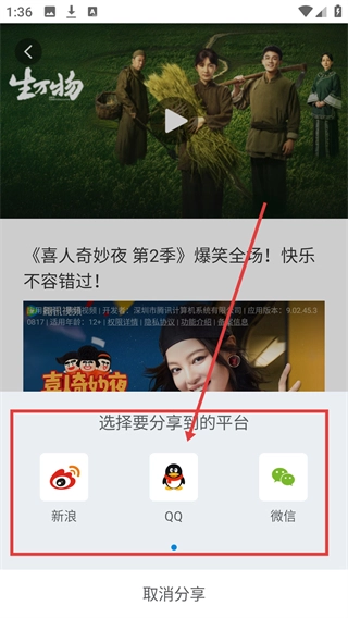 进入内容详情页后,点击右下角的分享图标,就能打开分享平台的选择菜单啦。