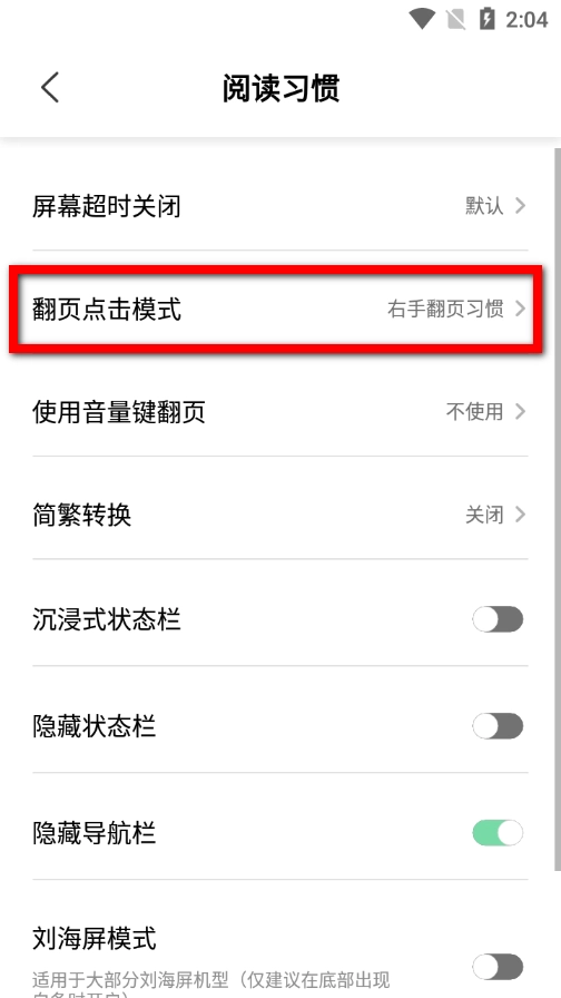 4、在阅读习惯页面,点击翻页点击模式选项。