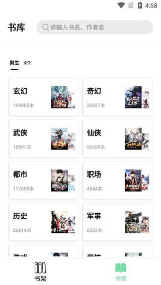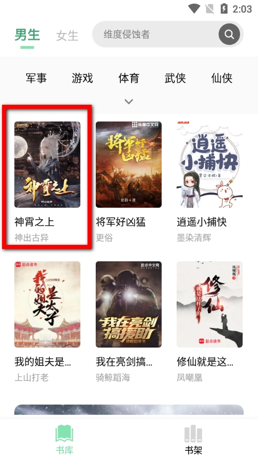 3、也可在书库界面,根据小说分类进行选择;