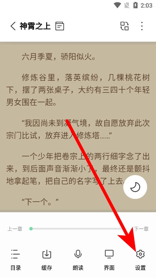 2、进入阅读界面后,轻点屏幕中间区域即可调出菜单,接着点击下方的设置选项,就能进入设置界面。
