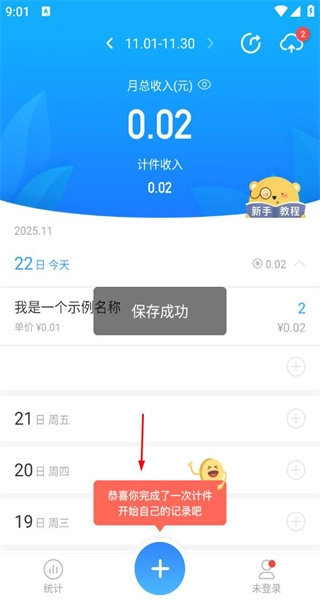 完成数据录入后,进入统计界面,看到月总收入和保存成功的提示,确认记录已成功保存,可继续进行其他操作。