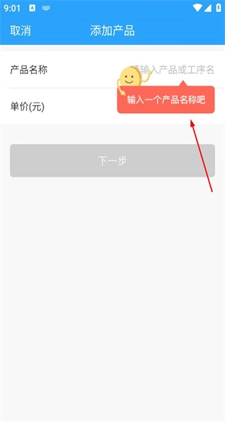 3、进入添加产品的界面后,能看到用于输入产品名称和单价的输入框,此时会提示输入产品名称,以便着手添加新的产品信息。