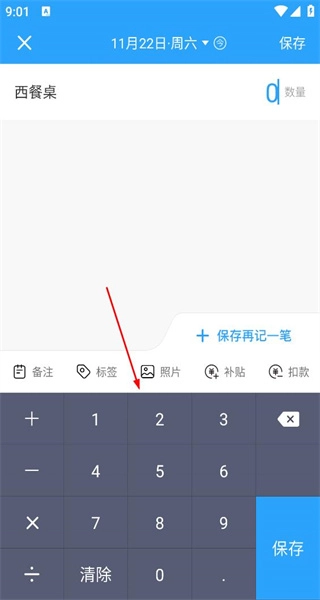 4、在数据记录界面的名称栏输入“西餐桌”,接着通过键盘输入对应的数量,完成该产品的记录步骤后,准备执行保存操作。