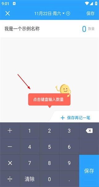 1、启动软件后,进入数据记录界面,该界面会呈现示例名称以及输入数量的提示信息,此时点击键盘输入数量,即可开始数据录入操作。