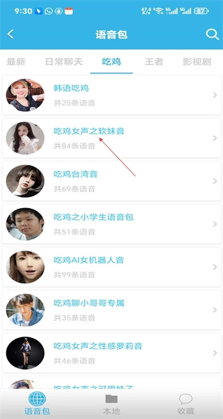 1、启动软件后,进入“吃鸡”分类,能看到韩语吃鸡、吃鸡女声之软妹音等多款语音包。