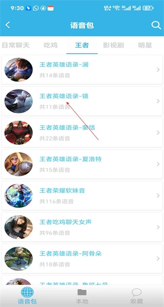2、切换至王者分类后,可看到镜、澜等英雄的语音包,这些语音包涵盖了多位英雄的语录,界面上展示着不同英雄的语音包供用户挑选。