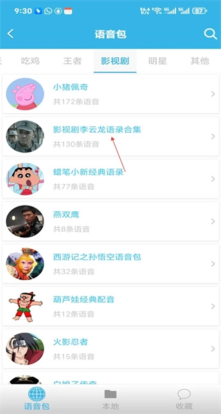 3、进入影视剧分类后,能看到小猪佩奇、影视剧李云龙语录合集等语音包,这个分类包含动漫、影视剧角色语音。