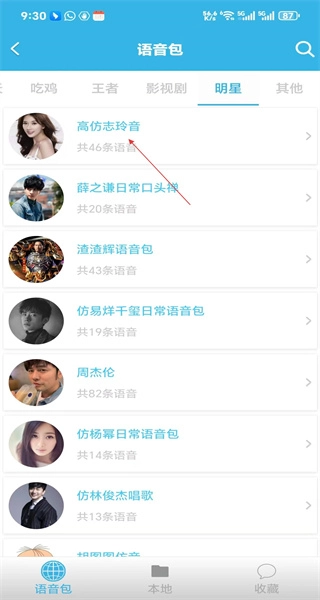 4、选择明星分类后,能看到高仿志玲音、薛之谦日常口头禅等语音包,界面上展示了多款不同明星风格的语音包,用户可以根据自己的喜好进行选择。