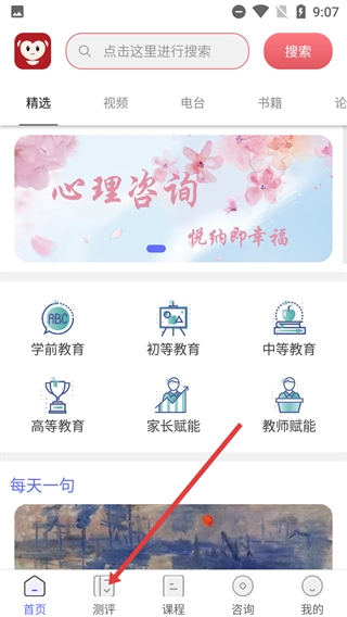 1、在软件首页,点击底部的【测评】按钮,即可进入测评功能页面。