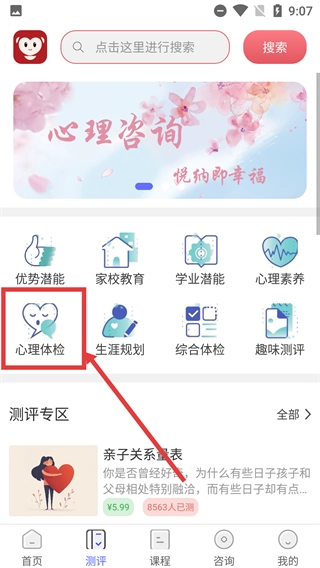 2、在测评页面中,找到并点击【心理体检】这一选项,随后进入心理体检的功能界面。
