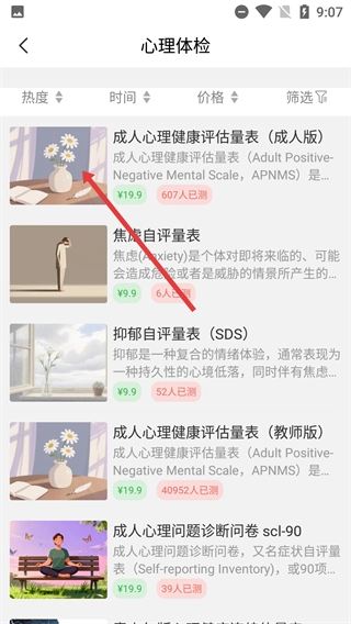 3、进入心理体检页面后,找到并选择【成人心理健康评估量表(成人版)】,即可进入该量表的测评详情页。