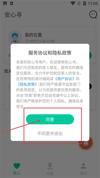 在使用【安心寻】之前,您需要先阅读【用户协议】与【隐私政策】,之后点击【同意】按钮,就能进入应用使用定位相关的服务了。