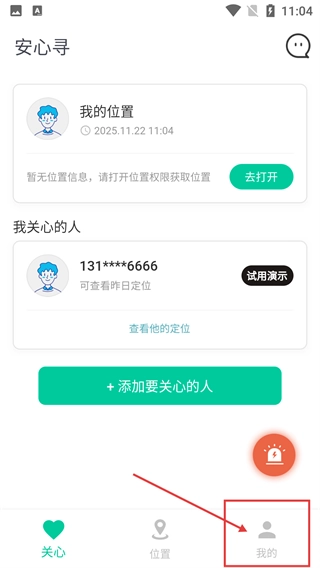 2、在【安心寻】的【关心】页面,你可以查看自己和关心对象的定位信息,点击【去打开】按钮就能开启位置权限,此外还能添加你关心的人。