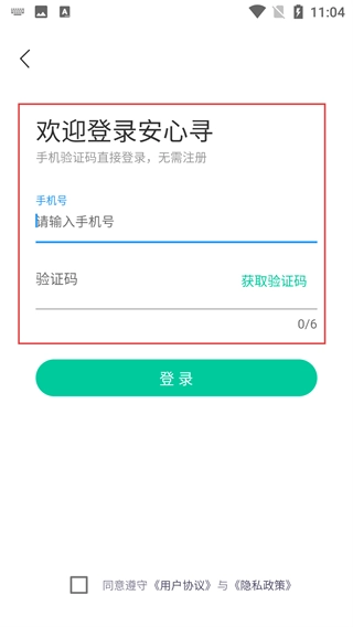 4、在【安心寻】的登录界面,无需进行注册操作,只需输入【号】并获取【验证码】,勾选同意相关协议后点击【登录】按钮,就能完成验证登录流程。