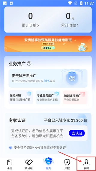 1、在应用首页能够查看【累计订单】【累计收益】,参与【安责险产品推广】等业务,还可以申请【专家认证】以增加服务机会。