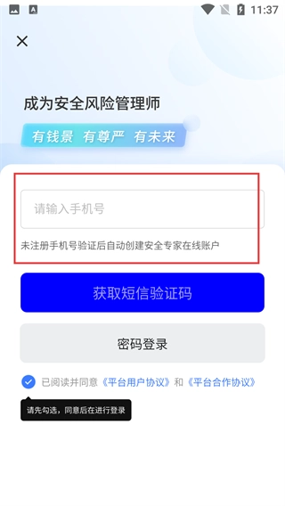 3、登录时输入【号码】,若该号码未注册,验证后会自动创建账户;操作时需先勾选同意协议,再点击【获取短信验证码】完成验证。