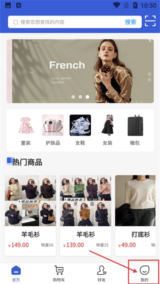 在购物类应用的首页,你可以通过分类入口(例如【童装】【护肤品】这类选项)来浏览商品,要是点击底部的【我的】按钮,就能进入个人中心页面。