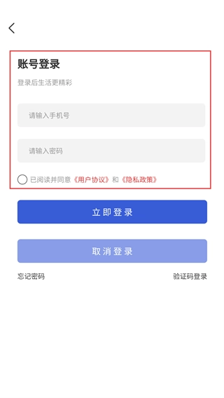 4、【账号登录】环节需填写【账号】与【密码】,勾选同意相关协议后即可完成登录,也可选择切换至【验证码登录】的方式进行操作。