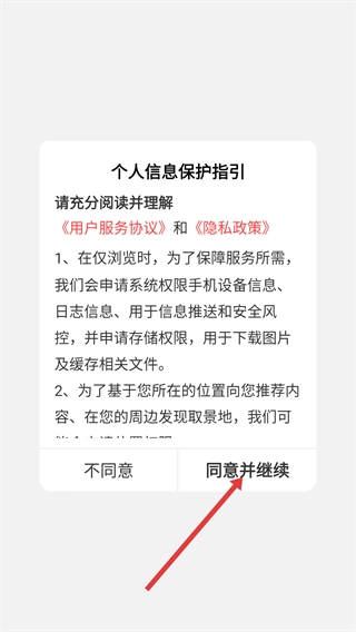 1、进入个人信息保护指引页面后,认真阅读《用户服务协议》与《隐私政策》,随后点击【同意并继续】按钮,即可开展后续操作。