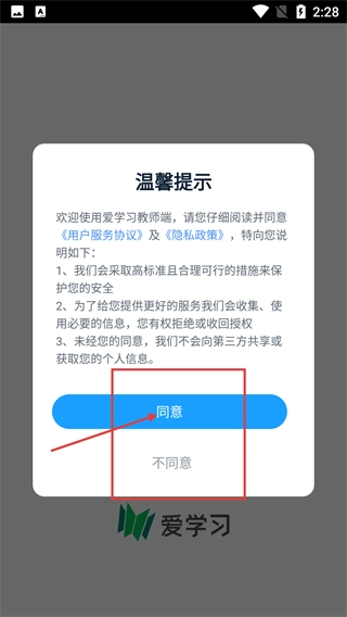 1、在使用【爱学习教师端】前,我们仅收集必要的信息,并且不会擅自共享个人信息,点击【同意】按钮就能进入应用。