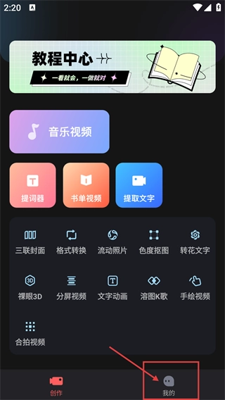 1、在【爱字幕】的创作界面,能使用“音乐视频”“提词器”“提取文字”等视频创作功能,点击底部的【我的】即可进入个人中心。