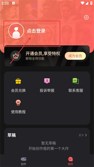 进入个人中心后,点击【点击登录】即可唤起登录界面。该平台支持通过开通会员解锁全部功能,同时还提供会员兑换、投诉举报等服务。