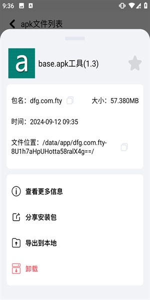 2、点击“查看更多”按钮可浏览所有APK文件,点击具体文件即可查看该软件的包名、存储位置、文件大小等详细信息。