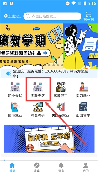 1、在软件首页找到并点击【实践专区】,即可进入兼职工作的分类界面。