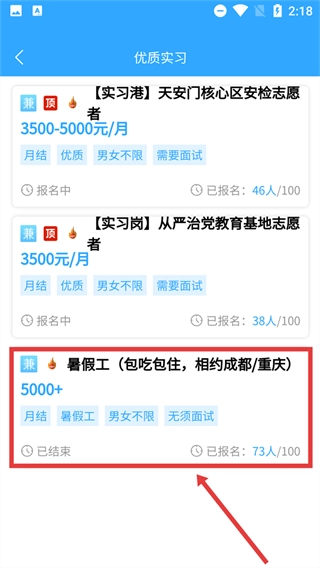3、从优质实习岗位列表里,挑选像【暑假工(包吃包住,相约成都/重庆)】这样的目标岗位,然后进入兼职详情页面。