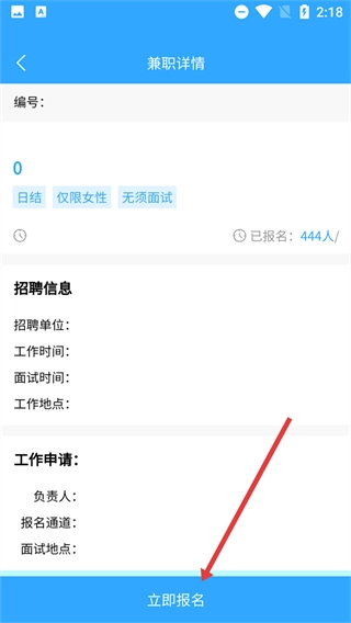 4、进入兼职详情页面后,点击【立即报名】按钮,提交兼职报名申请。